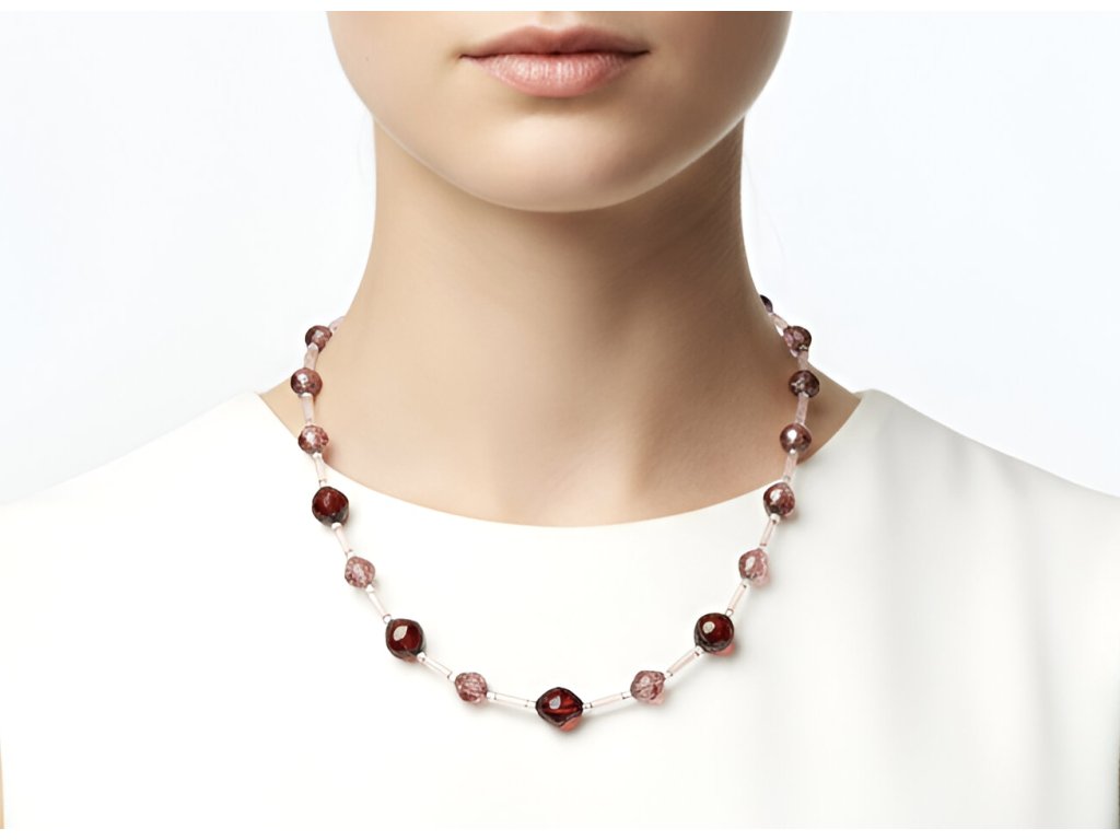 Náhrdelník s ohňovým perlami v proměnlivých odstínech růžové, červené a zlaté a pudrově růžovými tyčinkami