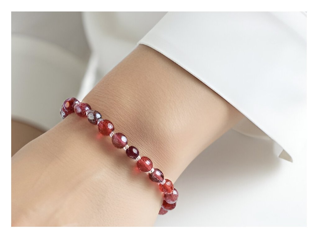 Náramek z broušených černých skleněných perel V červených odstínech.